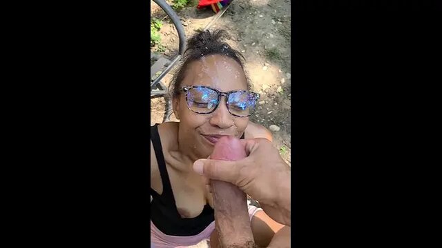 A cute nerdy girl with glasses sucks a huge black cock and swallows a massive load. She even plays with his balls before going down on him again for another round. The painted nails add a sensual touch to this outdoor fun.