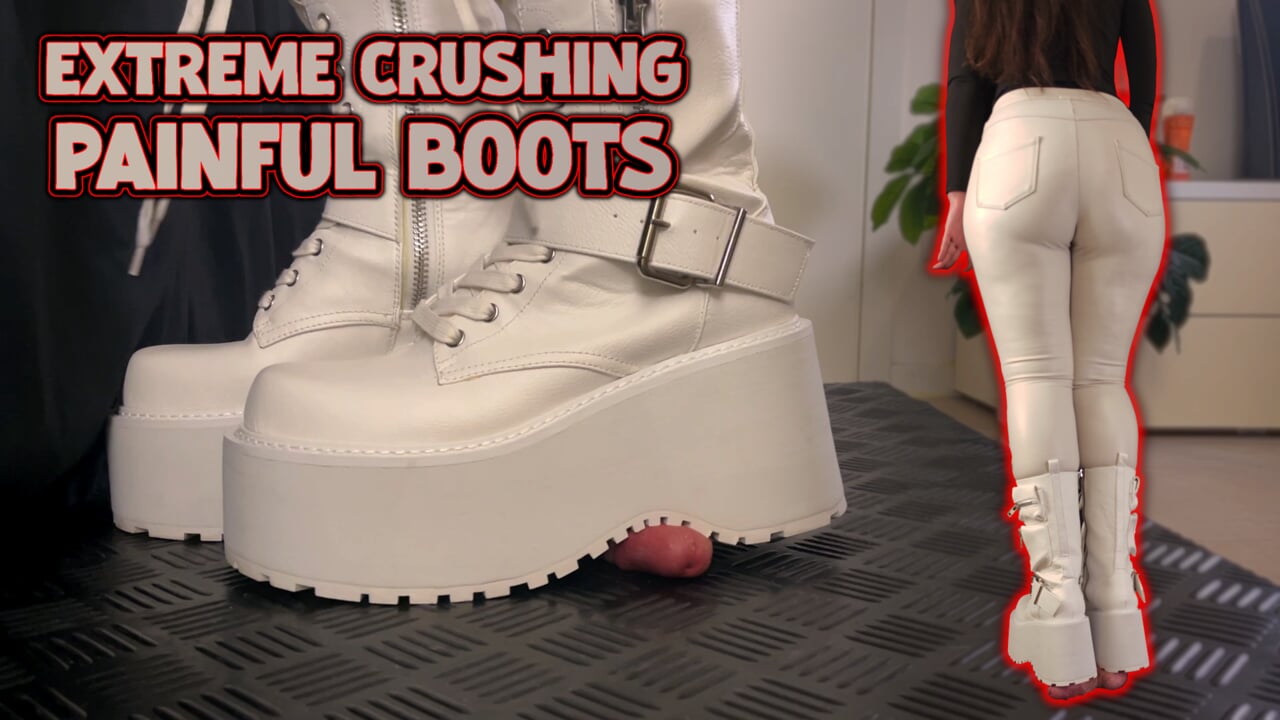 A femdom mistress crushes her slave's balls with giant platform boots while dominating him. She then gives him a humiliating shoejob, forcing him to worship her feet. The powerful boots leave him cumming all over her shoes, fulfilling her dominant fantasies.