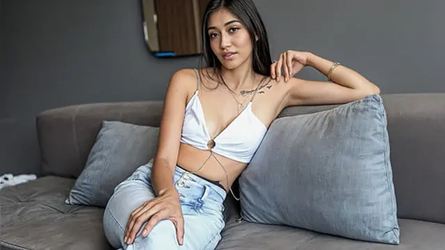 Skinny slut in sexy lingerie sucks a huge beefy cock, drooling it up real nice before riding it hard into the sunset cow
