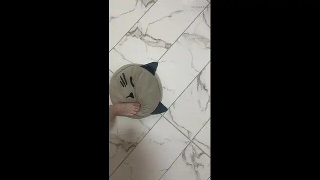 Seductive foot mistress dominates her helpless foot slave with her shiny nylon feet. She watches as her strong feet crush a pillow and move over his body, leaving him panting and eager for more. She then proceeds to give him a satisfying footjob, ensuring he is completely under her control.