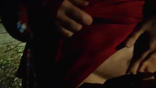 A mature Russian slut wears a red dress and has big natural boobs. She's in a public park with her boyfriend when he decides to use a butt plug on her. He slams into her from behind, making her moan loudly as she cums. The POV shows his cock hitting her tits and face at the end.